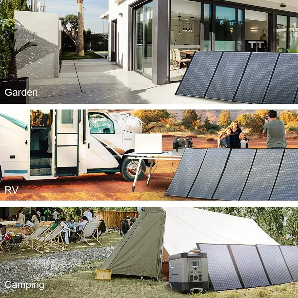 The 200W Foldable Solar Panel is a lightweight, high-efficiency option that offers up to 22% energy conversion. It’s designed to be compatible with most portable power stations and comes with a variety of connectors for versatility. Built with IP66 waterproof nylon and an adjustable bracket, this panel is perfect for camping, motorhomes, and off-grid adventures. Weighing only 13.9 lbs and measuring 25.6 x 20.3 x 2.4 inches when folded, it’s easy to pack and carry.