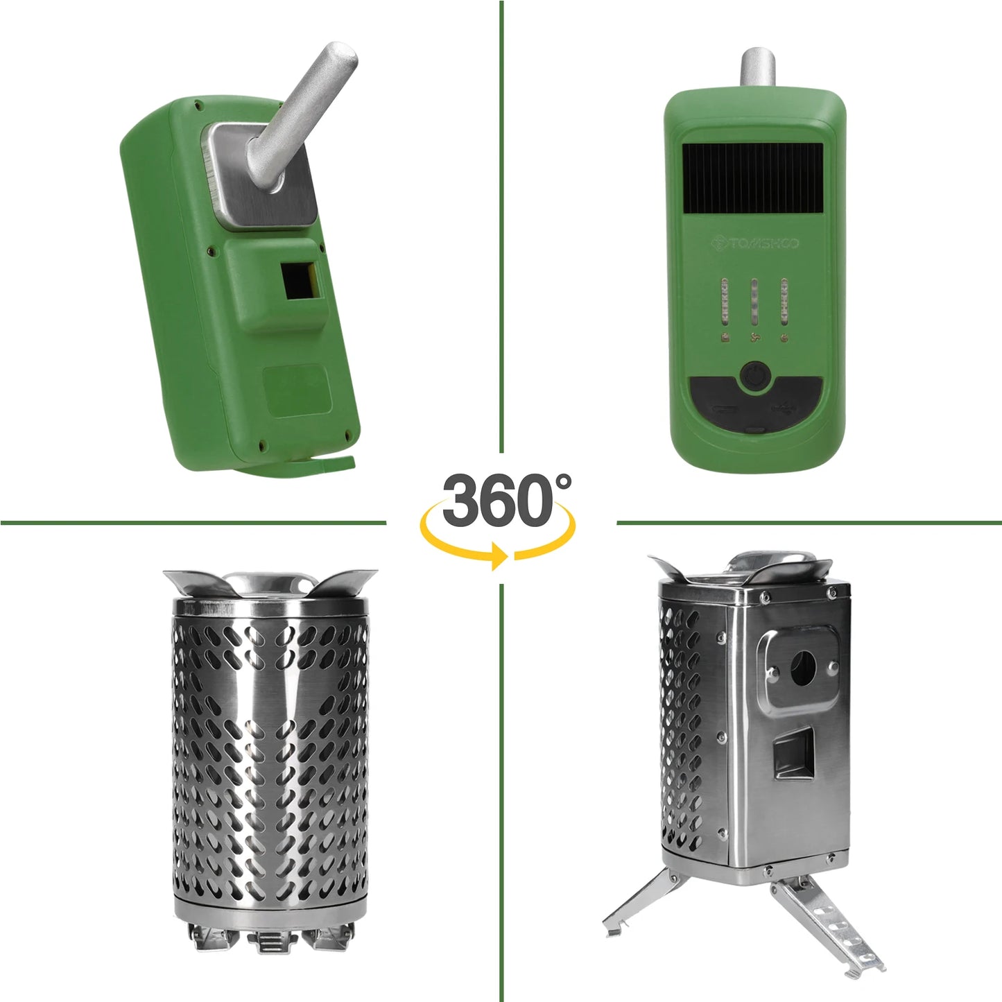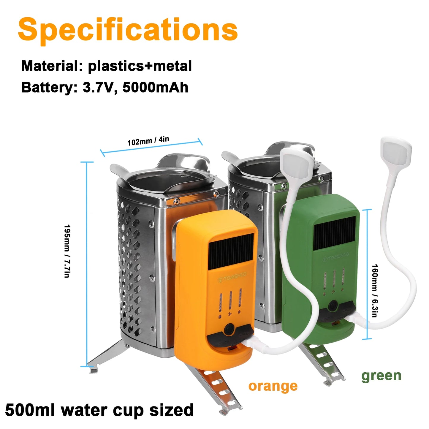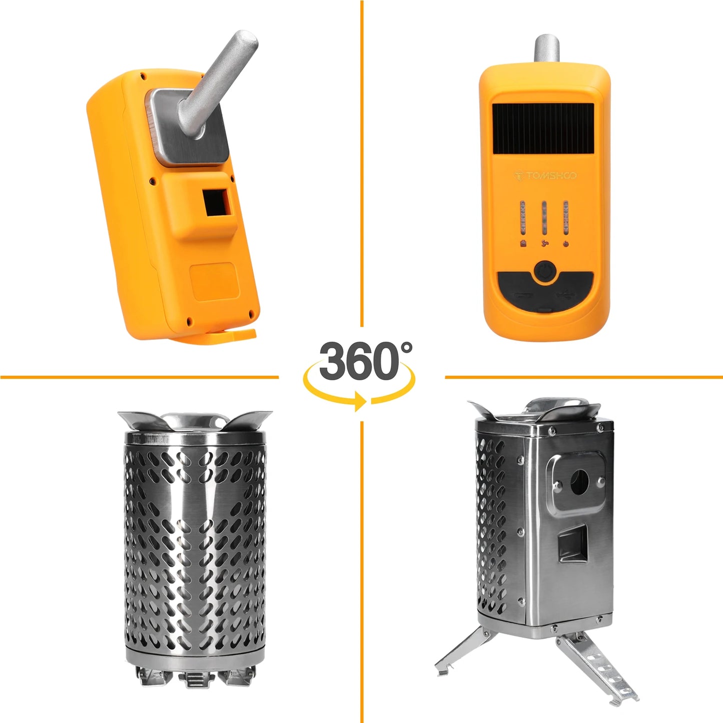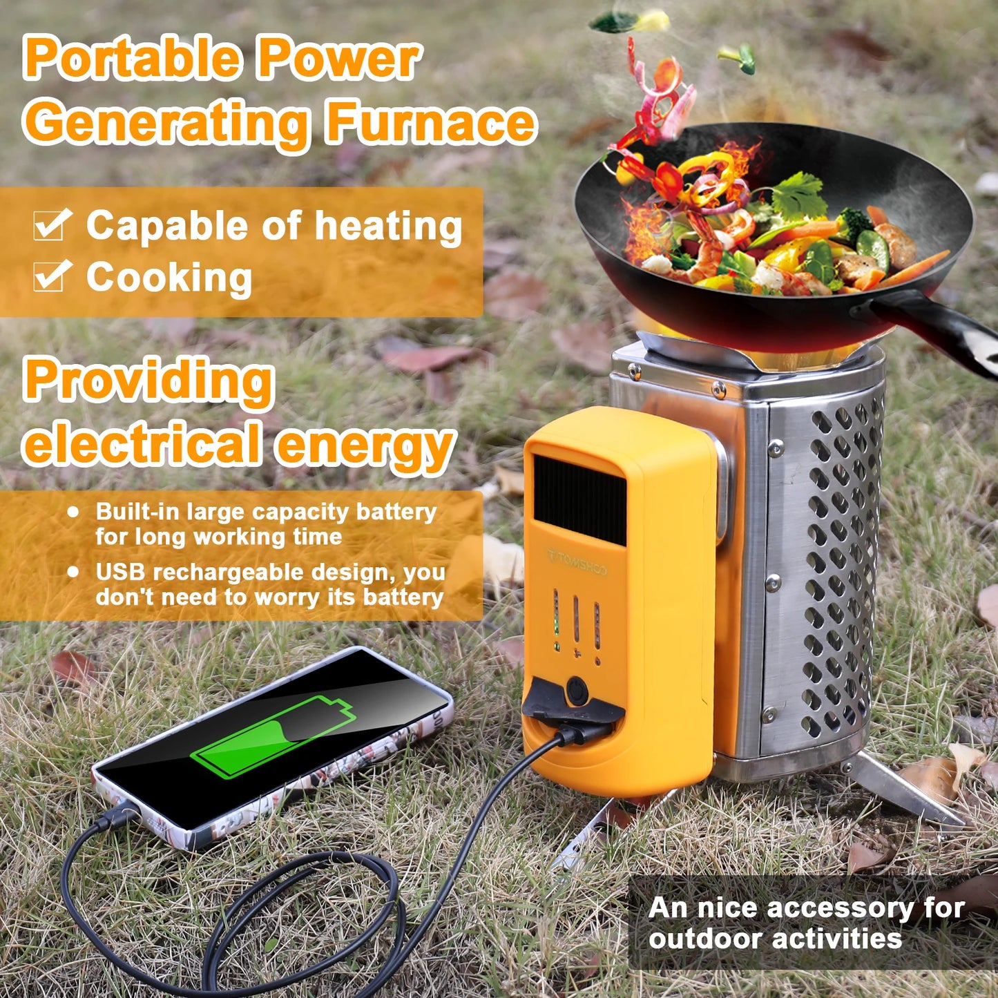 This compact camp stove converts firepower into electricity, providing off-grid cooking and USB recharging. It features a metal furnace and a USB-compatible recharging module. Just add small branches or wood chips, ignite, and enjoy cooking while recharging your devices. Perfect for camping, hiking, and emergencies.