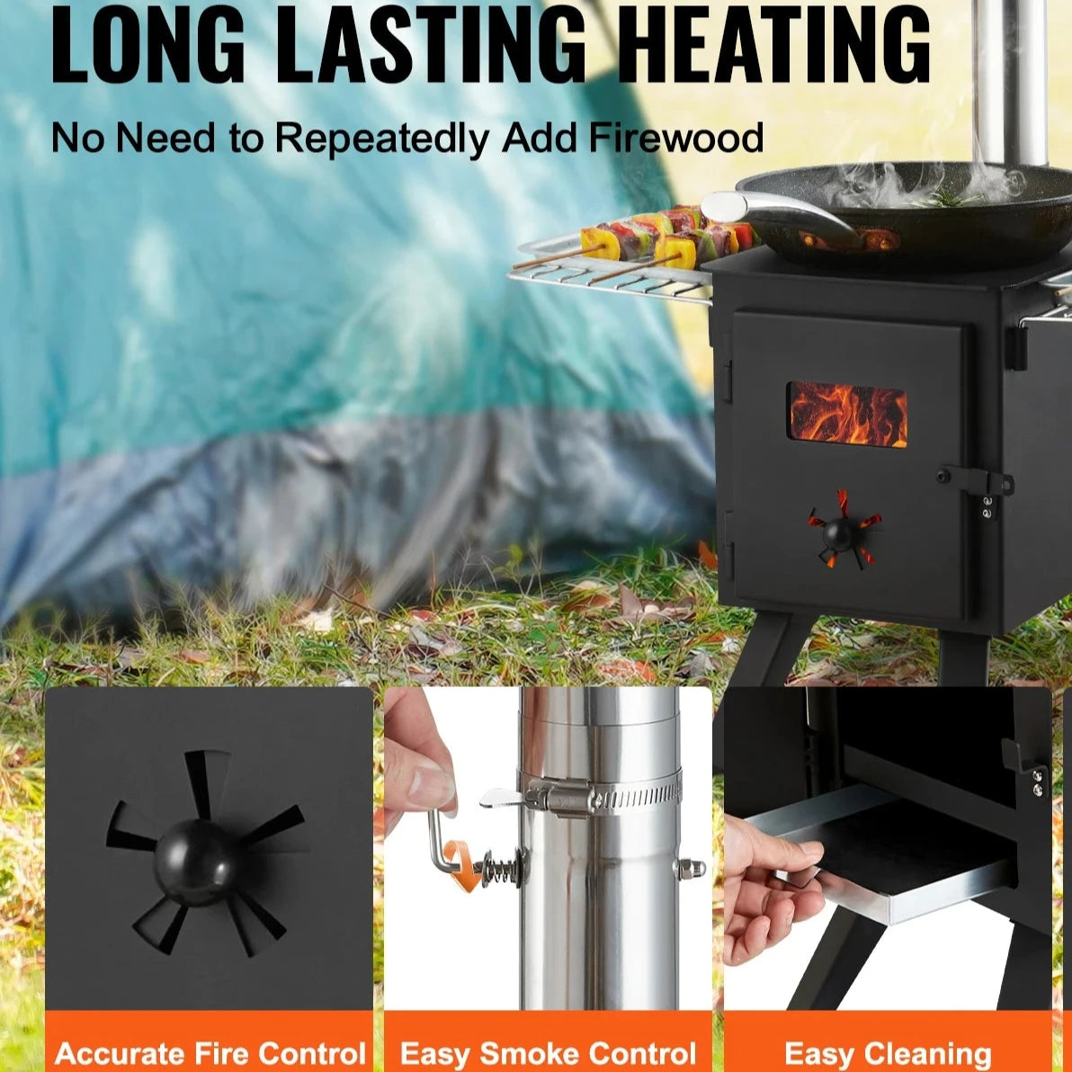 This versatile camping wood stove is built for efficient heating, with a large firebox and secondary combustion for high wood burn rates and reduced ash. Made from corrosion-resistant alloy steel with reinforced panels, it offers durability and odorless heating for outdoor adventures.